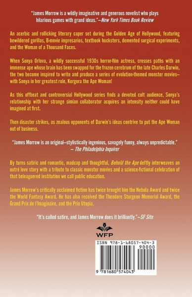 An acerbic, entertaining caper of evolution, gangsters, Darwin's brain, and the Golden Age of Hollywood. When Sonya Orlova, a successful 1930s horror-film actress, crosses paths with a gorilla whose brain has been swapped for the frozen cerebrum of the late Charles Darwin, the two are inspired to write and produce evolution-themed monster movies-with Sonya in her greatest role, Korgora the Ape Woman! As this offbeat and controversial Hollywood series finds a devoted cult audience, Sonia's relationship with her strange simian collaborator acquires an intensity neither could have imagined. Then disaster strikes, as zealous opponents to Darwin's ideas contrive to put the Ape Woman out of business. By turns satiric and romantic, madcap and thoughtful, Behold the Ape is at once an outré love story, a tribute to classic monster movies, and a science-fictional celebration of that beleaguered institution we call public education.