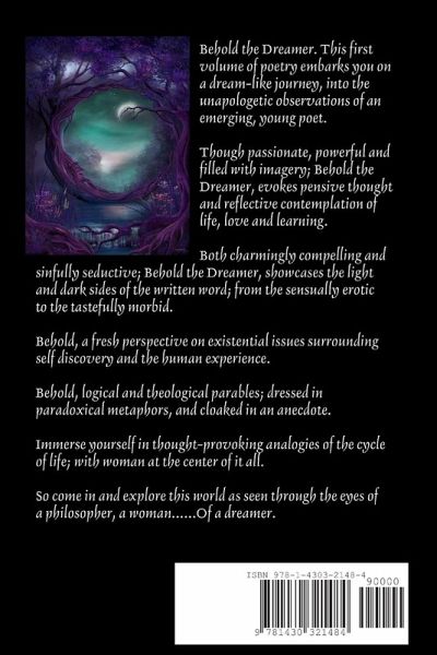 Behold the Dreamer. This first volume of poetry embarks you on a dream-like journey, into the unapologetic observations of an emerging, young poet. Though passionate, powerful and filled with imagery; Behold the Dreamer, evokes pensive thought and reflective contemplation of life, love and learning. Both charmingly compelling and sinfully seductive; Behold the Dreamer, showcases the light and dark sides of the written word; from the sensually erotic to the tastefully morbid. Behold, a fresh perspective on existential issues surrounding self discovery and the human experience. Behold, logical and theological parables; dressed in paradoxical metaphors, and cloaked in an anecdote. Immerse yourself in thought-provoking analogies of the cycle of life; with woman at the center of it all. So come in and explore this world as seen through the eyes of a philosopher, a woman............Of a dreamer.