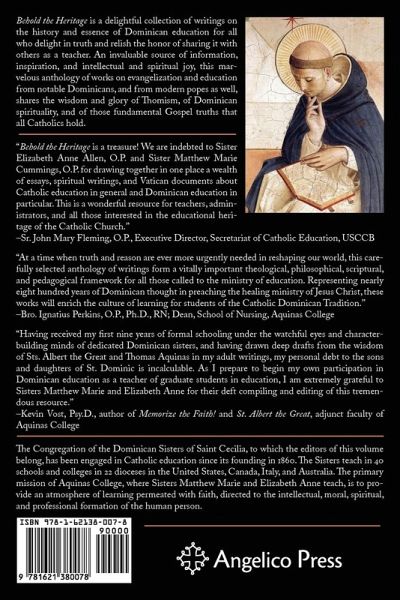 Behold the Heritage is a delightful collection of writings on the history and essence of Dominican education for all who delight in truth and relish the honor of sharing it with others as a teacher. An invaluable source of information, inspiration, and intellectual and spiritual joy, this marvelous anthology of works on evangelization and education from notable Dominicans, and from modern popes as well, shares the wisdom and glory of Thomism, of Dominican spirituality, and of those fundamental Gospel truths that all Catholics hold. "Behold the Heritage is a treasure! This is a wonderful resource for teachers, administrators, and all those interested in the educational heritage of the Catholic Church." --Sr. John Mary Fleming, O.P., Executive Director, Secretariat of Catholic Education, USCCB "Representing nearly eight hundred years of Dominican thought in preaching the healing ministry of Jesus Christ, these works will enrich the culture of learning for all students of the Catholic Dominican Tradition." --Bro. Ignatius Perkins, O.P.; Dean, School of Nursing, Aquinas College