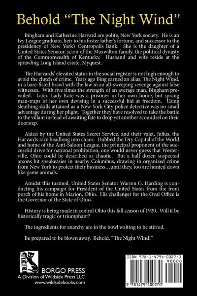 Bingham Harvard and his wife Katherine are pillars of New York society. But the Harvards' elevated status isn't high enough for them to avoid the clutch of crime, for unknown to most, Bingham is also The Night Wind, a hard-bitten crime-fighter with five times the strength of an average man. Together the pair resolve to take the battle against evil straight to the villains, rather than wait for fate to drop another scoundrel on their doorstep. Aided by the US Secret Service and by their valet, Julius, the Harvards race headlong to Westerville, Ohio, the "Dry Capital" of the World--home to the Anti-Saloon League, leader of the successful drive for national prohibition. Then a half dozen speakeasies go up in flames in nearby Columbus, drawing organized crime thugs from New York to protect their business. Amidst this turmoil, Senator Warren G. Harding is conducting his campaign for President from the front porch of his home in Marion, Ohio. History is being made in central Ohio in the fall of 1920: will it be tragic or triumphant? Be prepared to be blown away by the first new Night Wind novel in nine decades. BEHOLD THE NIGHT WIND!