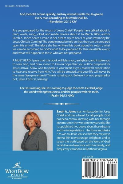 And, behold, I come quickly; and my reward is with me, to give to every man according as his work shall be. -Revelation 22:12 KJV Are you prepared for the return of Jesus Christ? People have talked about it, read, wrote, sung, joked, and made movies about it. In March 2006, author Sarah A. Jones heard a voice in her dream say to her, "Let your testimony be: 'Jesus Christ is Coming!' The people must be told so that they can be prepared upon His arrival." Therefore she has written this book about His return; what we can do according to God's word to be prepared for this inevitable event; and what will happen to those who are not prepared. A MUST READ! I pray that this book will bless you, enlighten, and inspire you to seek God, and draw closer to Him in hope that you will be prepared for Jesus' arrival. Allow God to speak to your heart as you read with expectation to hear and receive from Him. You will be amazed, and your life will never be the same. We guarantee it! Time is running out. Believe it or not; prepared or not; Jesus Christ is coming! For He is coming, for He is coming to judge the earth. He shall judge the world with righteousness, and the peoples with His truth. -Psalm 96:13 NJKV