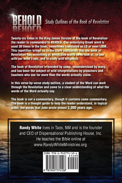 Twenty-six times in the King James Version of the book of Revelation the reader is commanded to BEHOLD. The underlying Greek word is used 30 times in the book, sometimes translated as LO or even LOOK. This repetition brings us to the stark realization that the book of Revelation has something at which God wants us to look at, to see with our mind’s eye, and to study with diligence. The book of Revelation is avoided by some, misunderstood by many, and has been the subject of wild interpretations by preachers and teachers who see far more than the words actually claim. In this verse-by-verse study outline, a student of the Word can work through the Revelation and come to a clear understanding of what the words of the Word actually say. The book is not a commentary, though it contains some commentary. The book is a thought-guide to help the reader understand, in logical order, the words that John wrote almost 2,000 years ago.