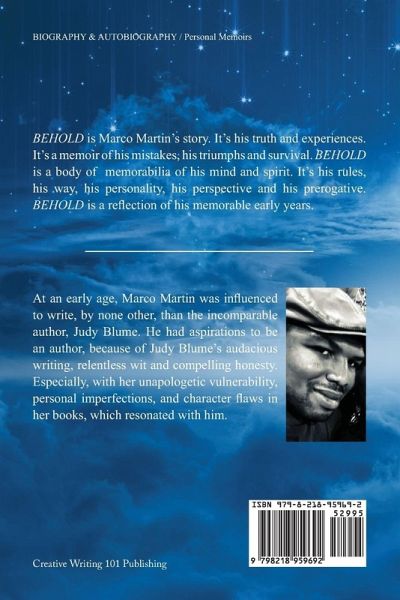 BEHOLD is Marco Martin's story. It's his truth and experiences. It's a memoir of his mistakes, his triumphs and survival. BEHOLD is a body of memorabilia of his mind and spirit. It's his rules, his way, his personality, his perspective and his prerogative. BEHOLD is a reflection of his memorable early years.