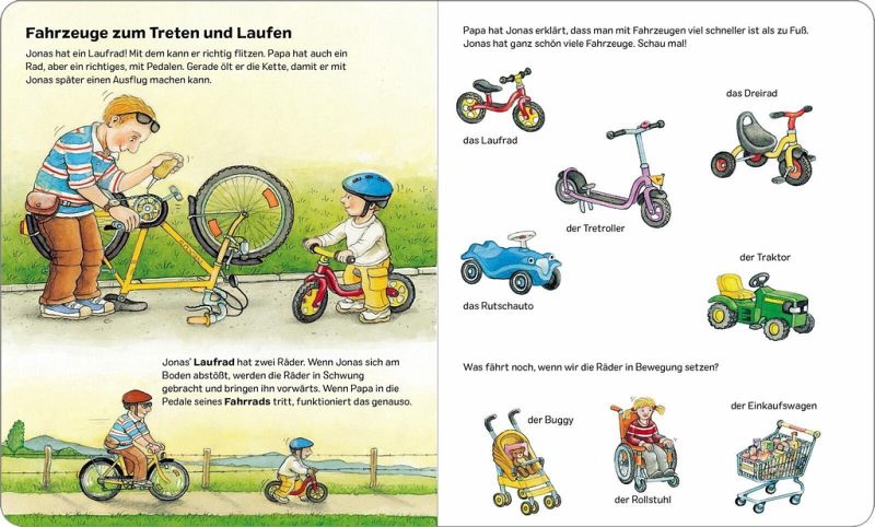 Realistische Illustrationen zeigen die Lieblingsfahrzeuge der Kleinen. Vom Mähdrescher, über den Krankenwagen, den Radlader oder den Betonmischer, hier gibt es viel zu entdecken.