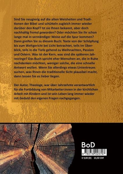 Sind Sie neugierig auf die alten Weisheiten und Traditionen der Bibel und schütteln zugleich immer wieder darüber den Kopf? Ist sie Ihnen bekannt, aber doch nachhaltig fremd geworden? Oder möchten Sie ihr schon lange mal in verständiger Weise auf die Spur kommen? Dann greifen Sie zu diesem Buch: Texte von der Schöpfung bis zum Weltgericht bei Licht betrachtet, teils im Überblick, teils in die Tiefe gehend zu Weihnachten, Passion und Ostern. Was ist der Kern, was sind die späteren Jahresringe? Das Buch spricht eher Menschen an, die in Ruhe nachdenken möchten, weniger solche, die eine schnelle Antwort wollen. Wenn Sie allerdings etwas Linientreues suchen, was Ihnen die traditionelle Sicht plausibel macht, dann lassen Sie es lieber liegen.