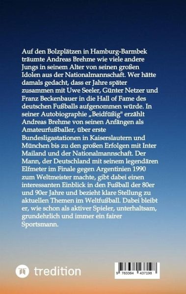 Auf den Bolzplätzen in Hamburg-Barmbek träumte Andreas Brehme wie viele andere Jungs in seinem Alter von seinen großen Idolen aus der Nationalmannschaft. Wer hätte damals gedacht, dass er Jahre später zusammen mit Uwe Seeler, Günter Netzer und Franz Beckenbauer in die Hall of Fame des deutschen Fußballs aufgenommen würde. In seiner Autobiographie "Beidfüßig" erzählt Andreas Brehme von seinen Anfängen als Amateurfußballer, über erste Bundesligastationen in Kaiserslautern und München bis zu den großen Erfolgen mit Inter Mailand und der Nationalmannschaft. Der Mann, der Deutschland mit seinem legendären Elfmeter im Finale gegen Argentinien 1990 zum Weltmeister machte, gibt dabei einen interessanten Einblick in den Fußball der 80er und 90er Jahre und bezieht klare Stellung zu aktuellen Themen im Weltfußball. Dabei bleibt er, wie schon als aktiver Spieler, unterhaltsam, grundehrlich und immer ein fairer Sportsmann.