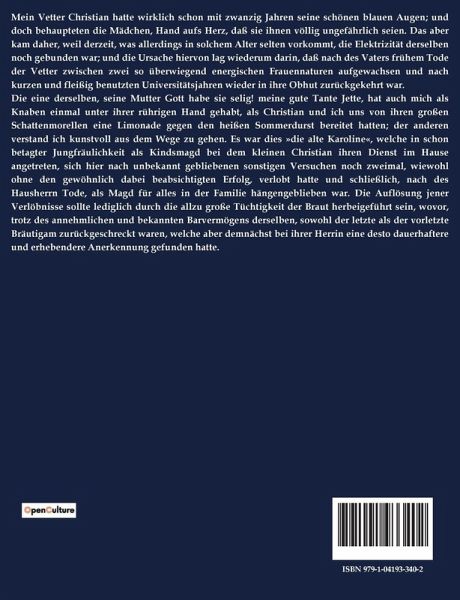 Mein Vetter Christian hatte wirklich schon mit zwanzig Jahren seine schönen blauen Augen; und doch behaupteten die Mädchen, Hand aufs Herz, daß sie ihnen völlig ungefährlich seien. Das aber kam daher, weil derzeit, was allerdings in solchem Alter selten vorkommt, die Elektrizität derselben noch gebunden war; und die Ursache hiervon lag wiederum darin, daß nach des Vaters frühem Tode der Vetter zwischen zwei so überwiegend energischen Frauennaturen aufgewachsen und nach kurzen und fleißig benutzten Universitätsjahren wieder in ihre Obhut zurückgekehrt war. Die eine derselben, seine Mutter Gott habe sie selig! meine gute Tante Jette, hat auch mich als Knaben einmal unter ihrer rührigen Hand gehabt, als Christian und ich uns von ihren großen Schattenmorellen eine Limonade gegen den heißen Sommerdurst bereitet hatten; der anderen verstand ich kunstvoll aus dem Wege zu gehen. Es war dies »die alte Karoline«, welche in schon betagter Jungfräulichkeit als Kindsmagd bei dem kleinen Christian ihren Dienst im Hause angetreten, sich hier nach unbekannt gebliebenen sonstigen Versuchen noch zweimal, wiewohl ohne den gewöhnlich dabei beabsichtigten Erfolg, verlobt hatte und schließlich, nach des Hausherrn Tode, als Magd für alles in der Familie hängengeblieben war. Die Auflösung jener Verlöbnisse sollte lediglich durch die allzu große Tüchtigkeit der Braut herbeigeführt sein, wovor, trotz des annehmlichen und bekannten Barvermögens derselben, sowohl der letzte als der vorletzte Bräutigam zurückgeschreckt waren, welche aber demnächst bei ihrer Herrin eine desto dauerhaftere und erhebendere Anerkennung gefunden hatte.