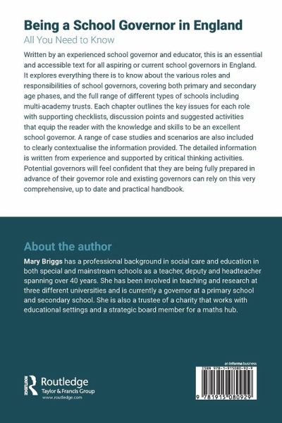 Chapter 1. What is governance? An introduction Chapter 2. School governors (Executive head/headteacher/head of school Teacher/non-teaching representative) Chapter 3. External governors (Parent Community Foundation Co-opted) Chapter 4. Governor's roles (Chair Sub committees chair Safeguarding SEND Subject or other area focused roles Complaints and appeals Involvement in recruitment of staff) Chapter 5. Governors' meetings Chapter 6. Governors' roles in monitoring Chapter 7. School governors and controlling bodies (LA, Academies, MATs) Chapter 8. Governance and Inspections (SIAMS and general) Chapter 9. Glossary of terms Chapter 10. Further support- training, mentoring, governor conferences 11 Index
