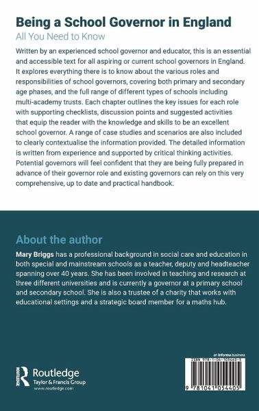 Chapter 1. What is governance? An introduction Chapter 2. School governors (Executive head/headteacher/head of school Teacher/non-teaching representative) Chapter 3. External governors (Parent Community Foundation Co-opted) Chapter 4. Governor's roles (Chair Sub committees chair Safeguarding SEND Subject or other area focused roles Complaints and appeals Involvement in recruitment of staff) Chapter 5. Governors' meetings Chapter 6. Governors' roles in monitoring Chapter 7. School governors and controlling bodies (LA, Academies, MATs) Chapter 8. Governance and Inspections (SIAMS and general) Chapter 9. Glossary of terms Chapter 10. Further support- training, mentoring, governor conferences 11 Index