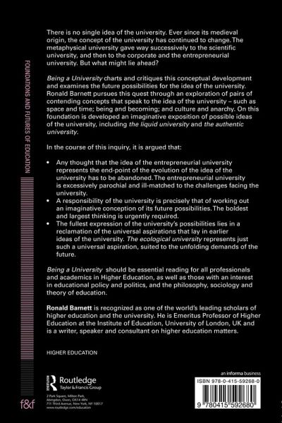 There is no single idea of the university. Ever since its medieval origin, the concept of the university has continued to change. The metaphysical university gave way successively to the scientific university, and then to the corporate and the entrepreneurial university. But what, then, might lie ahead? Being a University both charts this conceptual development and examines the future possibilities for the idea of the university. Ronald Barnett pursues this quest through an exploration of pairs of contending concepts that speak to the idea of the university - such as space and time; being and becoming; and culture and anarchy. On this foundation is developed an imaginative exposition of possible ideas of the university, including the liquid university and the authentic university. In the course of this inquiry, it is argued that: Any thought that the idea of the entrepreneurial university represents the end-point of the evolution of the idea of the university has to be abandoned. The entrepreneurial university is excessively parochial and ill-matched to the challenges facing the university A responsibility of the university is precisely that of working out an imaginative conception of its future possibilities. The boldest and largest thinking is urgently required The fullest expression of the university's possibilities lies in a reclamation of the universal aspirations that lay in earlier ideas of the university. The ecological university represents just such a universal aspiration, suited to the unfolding demands of the future. Being a University will be of wide interest, to institutional leaders and managers, higher education planners, academics in all disciplines and students of higher education, in educational policy and politics, and the philosophy, sociology and theory of education, and indeed, anyone who believes in the future of the university.