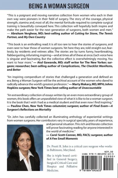 "This is a poignant and moving narrative collection from women who each in their own way were pioneers in their field of surgery. The story of the courage, physical strength, stamina and, most of all, the mental fortitude required to complete surgical training is beautifully conveyed here. This collection will hopefully both inspire and make the path easier for the next generation of surgeons, both women and men." - Abraham Verghese, MD; best-selling author of Cutting for Stone, The Tennis Partner, and My Own Country "This book is an enthralling read. It is all too rare to hear the stories of surgeons, and even rarer to hear those of women surgeons. Yet here they are, told straight out, fearlessly, by residents and retirees alike. The stories are by turns funny, heartbreaking, flabbergasting, infuriating, inspiring-and at times all of these at once. Each voice here is singular and fascinating. But the collective effect is overwhelmingly moving. You want to hear more." - Atul Gawande, MD; staff writer for The New Yorker; surgeon; researcher; best-selling author of Complications, The Checklist Manifesto, and Better "An inspiring compendium of stories that challenged a generation and defined an era. Being a Woman Surgeon will be the archival account of the women who dared to radically advance the world's greatest profession." - Marty Makary, MD, MPH; Johns Hopkins surgeon; New York Times best-selling author of Unaccountable "An extraordinary collection of essays written by an even more extraordinary group of women, this book offers an unparalleled view of what it is like to be a woman surgeon. It is the book that I wish I had as a medical student and that even now I find inspiring." - Pauline Chen, New York Times columnist; surgeon; author of Final Exam-A Surgeon's Reflections on Mortality "Dr. John has carefully collected an illuminating anthology of experiential writings from women surgeons. Her contributors vary in surgical specialty, years of experience, and personal situation. This rich and literate collection will prove fascinating reading for anyone interested in the world of medicine." - Carol Scott-Conner, MD, FACS; surgeon; author of A Few Small Moments Dr. Preeti R. John is a critical care surgeon who works in Baltimore, Maryland. She is triple board certified in General Surgery, Surgical Critical Care and Hospice and Palliative Medicine.