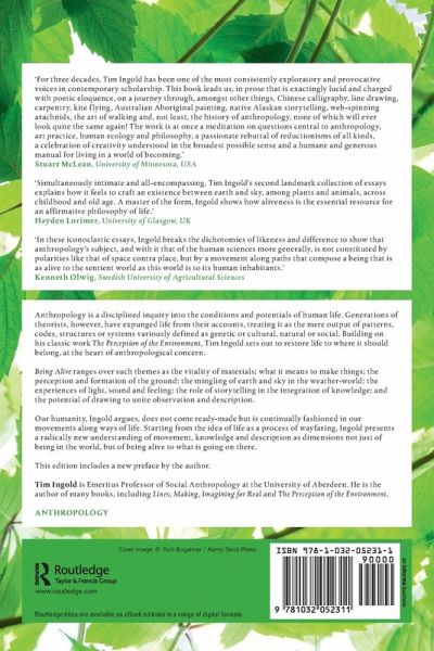 Anthropology is a disciplined inquiry into the conditions and potentials of human life. Generations of theorists, however, have expunged life from their accounts, treating it as the mere output of patterns, codes, structures or systems variously defined as genetic or cultural, natural or social. Building on his classic work The Perception of the Environment, Tim Ingold sets out to restore life to where it should belong, at the heart of anthropological concern.