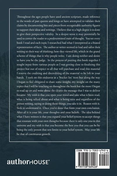 Throughout the ages people have used ancient scripture, made reference to the words of past queens and kings or have attempted to validate their claims by documenting bits and pieces from recognizable authority figures to support their ideas and writings. I believe that to a high degree it is done to give their perspective validity. In a deeper sense it may potentially be used to corner the reader to a predetermined train of thought. You see every book I read and each topic I researched had what I interpreted as a biased representation of facts. The author or writer seemed to lead and tailor their writing to their way of thinking; how they viewed life, which in the grand scheme of things that is why people write. I am doing neither and desire to have you be the judge. In the process of putting this book together I sought input from various people as I was getting close to finalizing this project but out of respect to all that will purchase and read this material I reserve the crediting and discrediting of the material to be left in your hands. I took on this endeavor as a 'bucket list' item but along the way I began to feel obligated to share some insight, my insight on the many topics that I will be touching on throughout the book but the more I began to read up on and write about the clearer the message that I was to deliver became. My wish is that you open your mind and take what is been read, what is being talked about and what is being seen and regardless of the person writing, saying or doing those things, you take it in. Reason with it. Seek to understand it. Once you've done that form your own conclusion. After all it is your life, your thoughts and your beliefs. The idea behind what I have written is that you expand your belief system to accept things that resonate with your own thoughts because there is only one you in this universe and my wish is that you become the best you that you can be by being the only person that sets limits to your belief system. May your life be that of continuous growth.