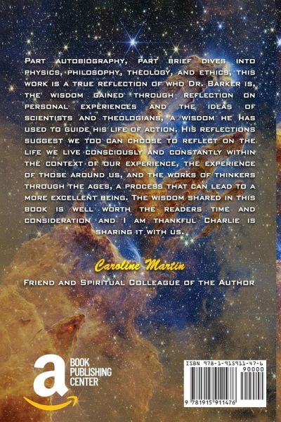 Part autobiography, part brief dives into physics, philosophy, theology, and ethics, this work is a true reflection of who Dr. Barker is, the wisdom gained through reflection on personal experiences and the ideas of scientists and theologians, a wisdom he has used to guide his life of action. His reflections suggest we too can choose to reflect on the life we live consciously and constantly within the context of our experience, the experience of those around us, and the works of thinkers through the ages, a process that can lead to a more excellent being. The wisdom shared in this book is well worth the readers time and consideration and I am thankful Charlie is sharing it with us. Caroline Martin, Friend and Spiritual Colleague of the Author.