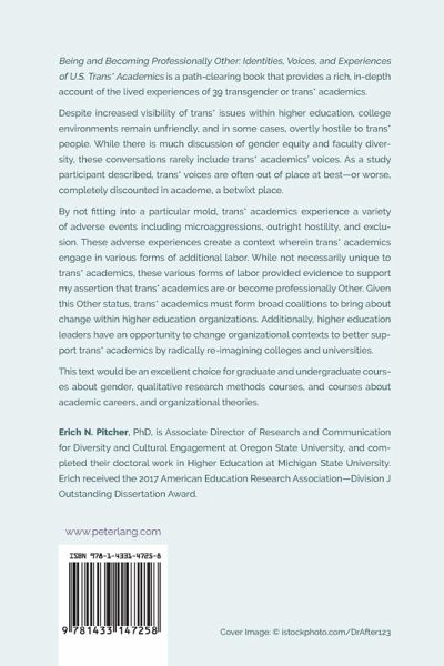 "In this moving and scholarly account, Erich N. Pitcher invites the reader to listen to our trans_ colleagues' accounts of their professional challenges, but, more importantly, asks us to extrapolate from our trans_ colleagues' daily challenges of hegemonic norms in the academy and to imagine a university true to its essential organizing principle-higher learning as freedom, enlightened, liberal and radical. Being and Becoming Professionally Other: Identities, Voices, and Experiences of U.S. Trans_ Academics gives us a view of our institutions and the academic profession that we should take in with eyes wide open." -Ana M. Martínez Alemán, Boston College