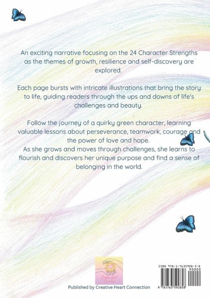 An exciting narrative focusing on the 24 Character Strengths as the themes of growth, resilience and self-discovery are explored. Each page bursts with intricate illustrations that bring the story to life, guiding readers through the ups and downs of life's challenges and beauty. Follow the journey of a quirky green character, learning valuable lessons about perseverance, teamwork, courage and the power of love and hope. As she grows and moves through challenges, she learns to flourish and discovers her unique purpose and find a sense of belonging in the world.