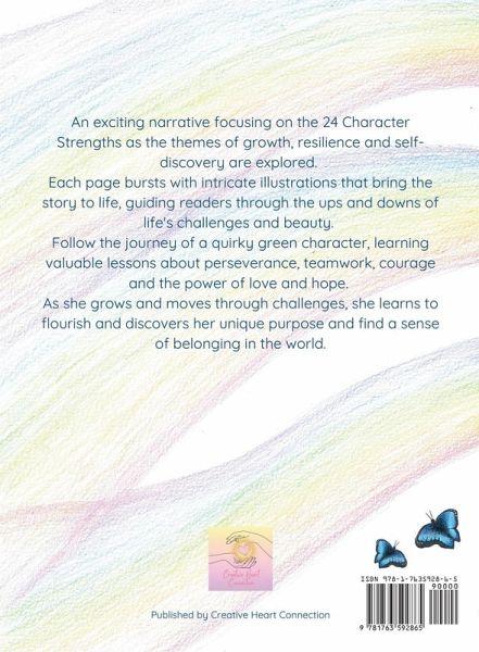 An exciting narrative focusing on the 24 Character Strengths as the themes of growth, resilience and self-discovery are explored. Each page bursts with intricate illustrations that bring the story to life, guiding readers through the ups and downs of life's challenges and beauty. Follow the journey of a quirky green character, learning valuable lessons about perseverance, teamwork, courage and the power of love and hope. As she grows and moves through challenges, she learns to flourish and discovers her unique purpose and find a sense of belonging in the world.