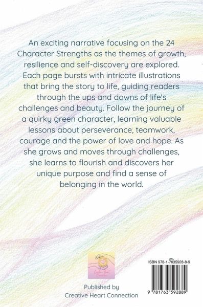 An exciting narrative focusing on the 24 Character Strengths as the themes of growth, resilience and self-discovery are explored. Each page bursts with intricate illustrations that bring the story to life, guiding readers through the ups and downs of life's challenges and beauty. Follow the journey of a quirky green character, learning valuable lessons about perseverance, teamwork, courage and the power of love and hope. As she grows and moves through challenges, she learns to flourish and discovers her unique purpose and find a sense of belonging in the world.