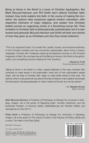 Being at Home in the World is a book of Christian Apologetics. But Mark McLeod-Harrison and Phil Smith don't defend Christian faith; instead, they invite readers into faith. In the course of making this invitation, the authors raise suspicions against modern naturalism, offer respectful criticisms of major religions, and explain how Christian beliefs provide an organizing center of a flourishing human life. Their invitation to Christian faith is philosophically sophisticated, but it is also honest and personal; McLeod-Harrison and Smith tell their own stories of how they grew up as Christians and why they remain believers.
