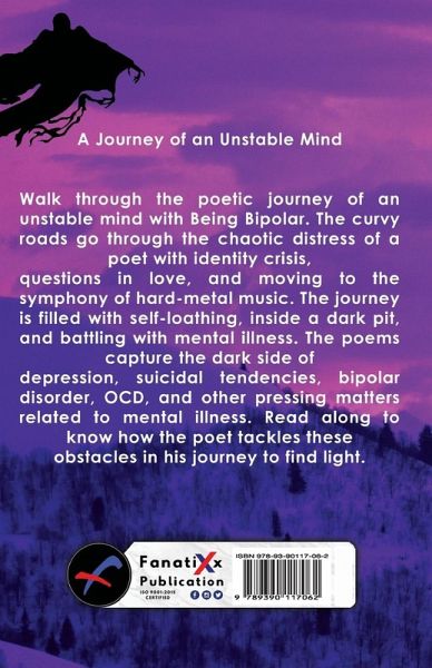 A Journey of an Unstable Mind Walk through the poetic journey of an unstable mind with Being Bipolar. The curvy roads go through the chaotic distress of a poet with identity crisis, questions in love, and moving to the symphony of hard-metal music. The journey is filled with self-loathing, inside a dark pit, and battling with mental illness. The poems capture the dark side of depression, suicidal tendencies, bipolar disorder, OCD, and other pressing matters related to mental illness. Read along to know how the poet tackles these obstacles in his journey to find light.
