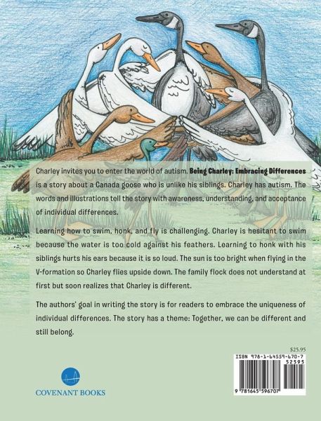Charley invites you to enter the world of autism. Being Charley: Embracing Differences is a story about a Canada goose who is unlike his siblings. Charley has autism. The words and illustrations tell the story with awareness, understanding, and acceptance of individual differences. Learning how to swim, honk, and fly are challenging. Charley is hesitant to swim because the water is too cold against his feathers. Learning to honk with his siblings hurts his ears because it is so loud. The sun is too bright when flying in the V-formation so Charley flies upside down. The family flock does not understand at first but soon realizes that Charley is different. The authors' goal in writing the story is for readers to embrace the uniqueness of individual differences. The story has a theme: Together, we can be different and still belong.