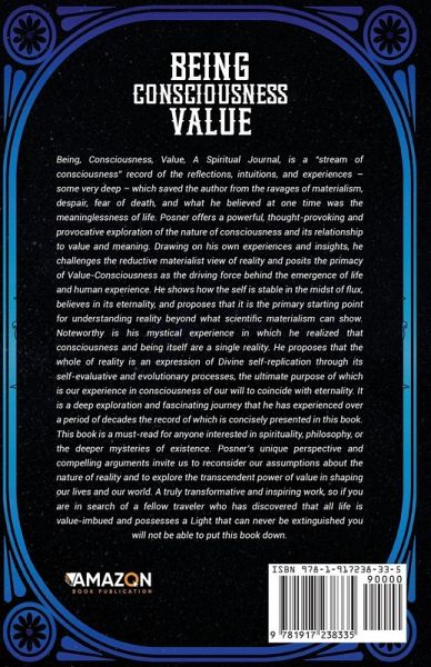 Being, Consciousness, Value, A Spiritual Journal, is a "stream of consciousness" record of the reflections, intuitions, and experiences - some very deep - which saved the author from the ravages of materialism, despair, fear of death, and what he believed at one time was the meaninglessness of life. Posner offers a powerful, thought-provoking and provocative exploration of the nature of consciousness and its relationship to value and meaning. Drawing on his own experiences and insights, he challenges the reductive materialist view of reality and posits the primacy of Value-Consciousness as the driving force behind the emergence of life and human experience. He shows how the self is stable in the midst of flux, believes in its eternality, and proposes that it is the primary starting point for understanding reality beyond what scientific materialism can show. Noteworthy is his mystical experience in which he realized that consciousness and being itself are a single reality. He proposes that the whole of reality is an expression of Divine self-replication through its self-evaluative and evolutionary processes, the ultimate purpose of which is our experience in consciousness of our will to coincide with eternality. It is a deep exploration and fascinating journey that he has experienced over a period of decades the record of which is concisely presented in this book. This book is a must-read for anyone interested in spirituality, philosophy, or the deeper mysteries of existence. Posner's unique perspective and compelling arguments invite us to reconsider our assumptions about the nature of reality and to explore the transcendent power of value in shaping our lives and our world. A truly transformative and inspiring work, so if you are in search of a fellow traveler who has discovered that all life is value-imbued and possesses a Light that can never be extinguished you will not be able to put this book down.