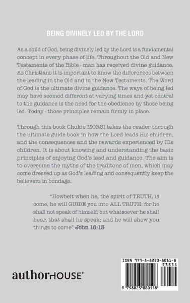 Being Divinely Led by the Lord As a child of God, being divinely led by the Lord is fundamental concept in every phase of life. Throughout the Old and New Testaments of the Bible - man has received divinde guidance. As Christians it is important to know the differences between the leading on the OLd and the New Testaments, The Word of God is the ultimate divine guidance. The ways of being led may have seemed different at varying times and yet central to the guidance is the need for the obedience by those being led. Today - those principles remain firmly in place. Through this book Chuckie Morsi takes the redear through the ultimate guide book oi how the Loed leads His children, and the consequences and the rewards experienced by His children. It is about knowing and understanding the basic principles of enjoying God's lead and guidance. The aim is to overcome the myths of the traditons of men, which may come dressed up as God's leading and consequently keep the believers in bongage. "Howbeit when he, the spirit of TRUTH, is come, he will GUIDE you into ALL TRUTH: for he shall not spea of himself; but whatsoever he shall hear, that shall he speak: and he will shew you things to come" John 16:13