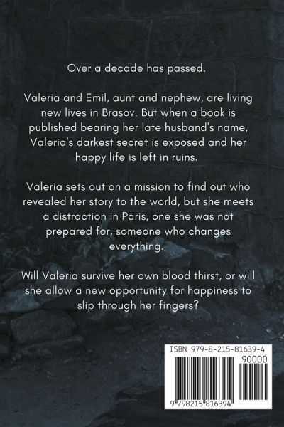Over a decade has passed. Valeria and Emil, aunt, and nephew, are living new lives in Brasov. But when a book is published bearing her late husband's name, Valeria's darkest secret is exposed, and her happy life is left in ruins. Valeria sets out on a mission to find out who revealed her story to the world, but she meets a distraction in Paris, one she was not prepared for, someone who changes everything. Will Valeria survive her own blood thirst, or will she allow a new opportunity for happiness to slip through her fingers?