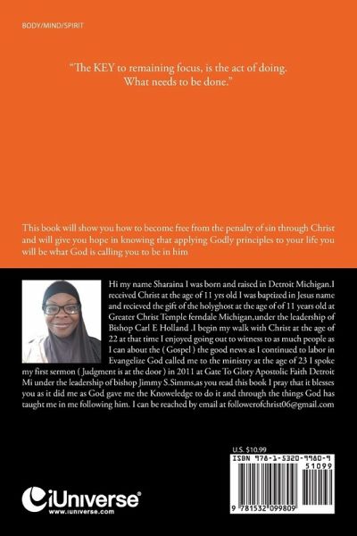 Hi my name Sharaina I was born and raised in Detroit Michigan.I received Christ at the age of 11 yrs old I was baptized in Jesus name and recieved the gift of the holyghost at the age of of 11 years old at Greater Christ Temple ferndale Michigan,under the leadership of Bishop Carl E Holland .I begin my walk with Christ at the age of 22 at that time I enjoyed going out to witness to as much people as I can about the ( Gospel ) the good news as I continued to labor in Evangelize God called me to the ministry at the age of 23 I spoke my first sermon ( Judgment is at the door ) in 2011 at Gate To Glory Apostolic Faith Detroit Mi under the leadership of bishop Jimmy S.Simms,as you read this book I pray that it blesses you as it did me as God gave me the Knoweledge to do it and through the things God has taught me in me following him. I can be reached by email at followerofchrist06@gmail.com