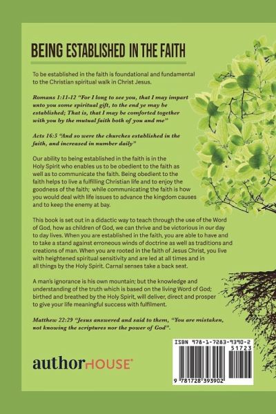 To be established in the faith is foundational and fundamental to the Christian spiritual walk in Christ Jesus. Romans 1:11-12 "For I long to see you, that I may impart unto you some spiritual gift, to the end ye may be established; That is, that I may be comforted together with you by the mutual faith both of you and me" Acts 16:5 "And so were the churches established in the faith, and increased in number daily" Our ability to being established in the faith is in the Holy Spirit who enables us to be obedient to the faith as well as to communicate the faith. Being obedient to the faith helps to live a fulfilling Christian life and to enjoy the goodness of the faith; while communicating the faith is how you would deal with life issues to advance the kingdom causes of God and to keep the enemy at bay. This book is set out in a didactic way to teach through the use of the Word of God, how as children of God, we can thrive and be victorious in our day to day lives. When you are established in the faith, you are able to have and to take a stand against erroneous winds of doctrine as well as traditions and creations of man. When you are rooted in the faith of Jesus Christ, you live with heightened spiritual sensitivity and are led at all times and in all things by the Holy Spirit. Carnal senses take a back seat. A man's ignorance is his own mountain; but the knowledge and understanding of the truth which is based on the living Word of God; birthed and breathed by the Holy Spirit, will deliver, direct and prosper to give your life meaningful success with fulfillment. Matthew 22:29 "Jesus answered and said to them, "You are mistaken, not knowing the scriptures nor the power of God"