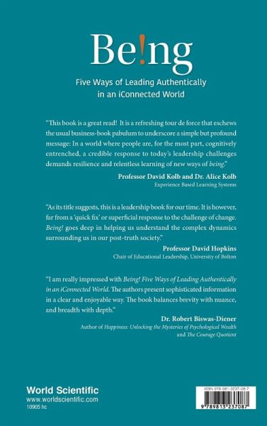 Being! Five ways of leading authentically in an iConnected world is rooted in leadership practice across many sectors and its raison d'etre is to build adaptiveness and resilience in uncertain times. It is credentialed by leaders who have honed their personal effectiveness, grown spiritually and become more effective and impactful, because of their engagement with its content. It channels wisdom at the intersection of many disciplines and multiple world views to provide deeper insight and meaning to the leadership dilemmas and choices that you constantly face. It integrates both western leadership-thinking with its more evidence-based, cognitive approaches, and eastern philosophy with its more "mystical" and spiritually-oriented homilies, into a rich tapestry that engages your attention, challenges your capabilities, and leaves you richer and more fulfilled for the effort.