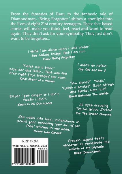 From the fantasies of Esau to the fantastic tale of Diamondman, Being Forgotten shines a spotlight on the lives of eight 21st Century teenagers. These fact based stories will make you think, feel, react and want to read again. They don't ask for your sympathy, they just don't want to be forgotten. Great stories for general reading includes a discussion section ideal for resource material in an educational setting.