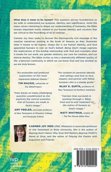 What does it mean to be human? This timeless question proves critical as we seek to understand our purpose, identity, and significance. Amidst the many voices clamoring to shape our understanding of humanity, the Bible reveals important truths related to our human identity and vocation that are critical to the flourishing of all of creation. Carmen Joy Imes seeks to recover the theologically rich message of the creation narratives starting in the book of Genesis as they illuminate what it means to be human. Every human being is created as God's image. Imago Dei is our human identity, and God appointed humans to rule on God's behalf. Being God's Image explores the implications of this kinship relationship with God and considers what it means for our work, our gender relations, our care for creation, and our eternal destiny. The Bible invites us into a dramatically different quality of life: a beloved community in which we can know God and one another as we are truly known. Includes a discussion guide for personal reflection or group study, as well as links to related video material through the BibleProject.