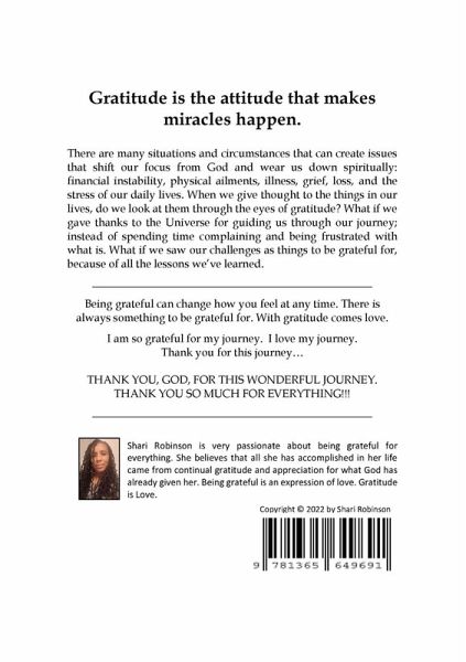 There are many situations and circumstances that can create issues that shift our focus from God and wear us down spiritually: financial instability, physical ailments, illness, grief, loss, and the stress of our daily lives. When we give thought to the things in our lives, do we look at them through the eyes of gratitude? What if we gave thanks to the Universe for guiding us through our journey; instead of spending time complaining and being frustrated with what is. What if we saw our challenges as things to be grateful for, because of all the lessons we've learned. This book was written to help people get into a position of gratitude.