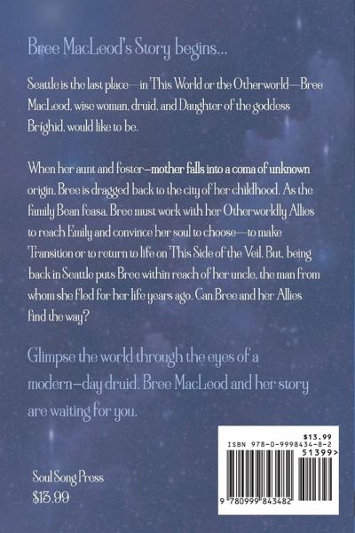 Bree MacLeod's Story begins... Seattle is the last place-in This World or the Otherworld-Bree MacLeod, wise woman, druid, and Daughter of the goddess Bríghid, would like to be. When her aunt and foster-mother falls into a coma of unknown origin, Bree is dragged back to the city of her childhood. As the family Bean feasa, Bree must work with her Otherworldly Allies to reach Emily and convince her soul to choose-to make Transition or to return to life on This Side of the Veil. But, being back in Seattle puts Bree within reach of her uncle, the man from whom she fled for her life years ago. Can Bree and her Allies find the way? Glimpse the world through the eyes of a modern-day druid. Bree MacLeod and her story are waiting for you.