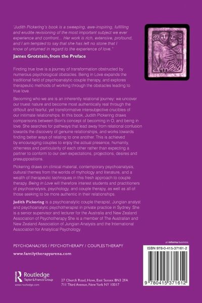 Finding true love is a journey of transformation obstructed by numerous psychological obstacles. Being in Love expands the traditional field of psychoanalytic couple therapy, and explores therapeutic methods of working through the obstacles leading to true love. Becoming who we are is an inherently relational journey: we uncover our truest nature and become most authentically real through the difficult and fearful, yet transformative intersubjective crucibles of our intimate relationships. In this book, Judith Pickering draws comparisons between Bion's concept of becoming in O, and being in love. She searches for pathways that lead away from relational confusion towards the discovery of genuine transformational relationships, and works towards finding better ways of relating to one another. This is achieved by encouraging couples to enjoy the actual presence, humanity, otherness and particularity of each other rather than expecting a partner to conform to our own expectations, projections, desires and presuppositions. Pickering draws on clinical material, contemporary psychoanalysis, cultural themes from the worlds of mythology and literature, and a wealth of therapeutic techniques in this fresh approach to couple therapy. Being in Love will therefore interest students and practitioners of psychoanalysis, psychology, and couple therapy, as well as all of those seeking to be more authentic in their relationships.