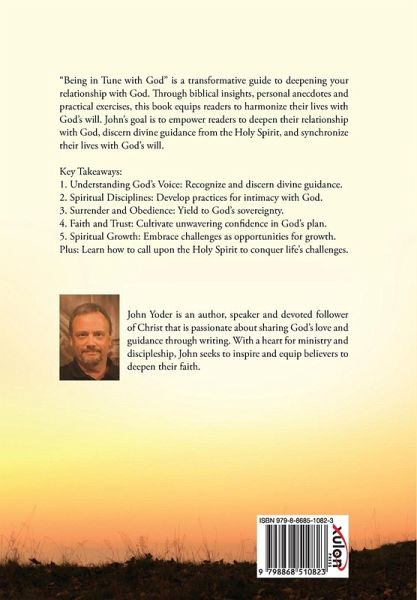 "Being in Tune with God" is a transformative guide to deepening your relationship with God. Through biblical insights, personal anecdotes and practical exercises, this book equips readers to harmonize their lives with God's will. John's goal is to empower readers to deepen their relationship with God, discern divine guidance from the Holy Spirit, and synchronize their lives with God's will. Key Takeaways: 1. Understanding God's Voice: Recognize and discern divine guidance. 2. Spiritual Disciplines: Develop practices for intimacy with God. 3. Surrender and Obedience: Yield to God's sovereignty. 4. Faith and Trust: Cultivate unwavering confidence in God's plan. 5. Spiritual Growth: Embrace challenges as opportunities for growth. Plus: Learn how to call upon the Holy Spirit to conquer life's challenges. John Yoder is an author, speaker and devoted follower of Christ that is passionate about sharing God's love and guidance through writing. With a heart for ministry and discipleship, John seeks to inspire and equip believers to deepen their faith.
