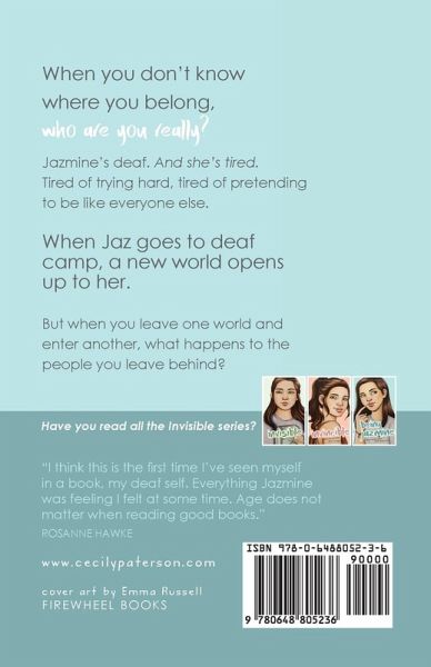Jazmine's deaf. And she's getting tired. Tired of having to try hard, tired of fitting in, tired of pretending to be like everyone else.When Jaz goes to deaf camp, a new world opens up to her. But when you leave one world and enter another, what happens to the people you leave behind? Which world will Jaz live in? Can she keep a foot in both? How will she figure out the best way to be Jazmine?Being Jazmine is the third book in Cecily Anne Paterson's Invisible series, featuring easy-to-love, hard-of-hearing teen Jazmine Crawford. The first book in the series, Invisible, was a semi-finalist in the Amazon Breakthrough Novel Award in 2014. The second, Invincible, was shortlisted in the Australian CALEB Prize in 2016.Review "Jazmine and her new friends are deaf but this is not a book about deafness. With a wonderful garden metaphor that resonates throughout the series, Being Jazmine offers believable characters and an unpredictable plot that would be perfect to add to any reading list. The series tackles teen relationships, mean girls, family secrets, fitting in, identity, and characters finding themselves."Dr Sharon Pajka, English Professor, Gallaudet University, Washington DC
