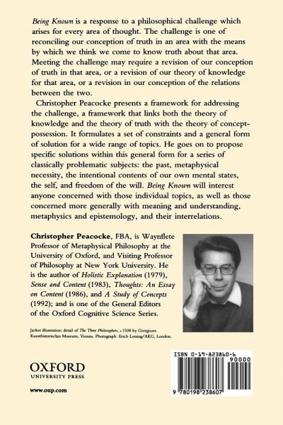 Being Known is a response to a philosophical challenge which arises for every area of thought: to reconcile a plausible account of what is involved in the truth of statements in a given area with a credible account of how we can know those statements. Christopher Peacocke presents a framework for addressing the challenge, a framework which links both the theory of knowledge and the theory of truth with the theory of concept-possession.