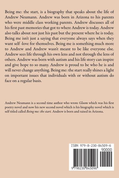 Being Me: The Start, is a biography that speaks about the life of Andrew Neumann. Andrew was born in Arizona to his parents who were middle class working parents. Andrew discusses all of his first past memories that got to where Andrew is today. Andrew also talks about not just his past but the present where he is today. Being me isn't just a saying that everyone always says when they want self -love for themselves. Being me is something much more to Andrew and Andrew wasn't meant to be like everyone else. Andrew sees life through his own lens and not through the lens of others. Andrew was born with autism and his life story can inspire and give hope to so many. Andrew is proud to be who he is and will never change anything. Being me: the start really shines a light on important issues that individuals with or without autism do face on a regular basis.