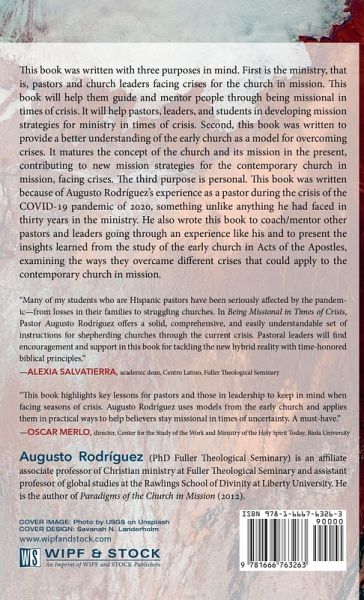 This book was written with three purposes in mind. First is the ministry, that is, pastors and church leaders facing crises for the church in mission. This book will help them guide and mentor people through being missional in times of crisis. It will help pastors, leaders, and students in developing mission strategies for ministry in times of crisis. Second, this book was written to provide a better understanding of the early church as a model for overcoming crises. It matures the concept of the church and its mission in the present, contributing to new mission strategies for the contemporary church in mission, facing crises. The third purpose is personal. This book was written because of Augusto Rodriguez's experience as a pastor during the crisis of the COVID-19 pandemic of 2020, something unlike anything he had faced in thirty years in the ministry. He also wrote this book to coach/mentor other pastors and leaders going through an experience like his and to present the insights learned from the study of the early church in Acts of the Apostles, examining the ways they overcame different crises that could apply to the contemporary church in mission.