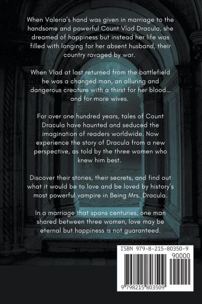 When Valeria's hand was given in marriage to the handsome and powerful Count Vlad Dracula, she dreamed of happiness but instead her life was filled with longing for her absent husband, their country ravaged by war. When Vlad at last returned from the battlefield, he was a changed man, an alluring and dangerous creature with a thirst for her blood... and for more wives. For over one hundred years, tales of Count Dracula have haunted and seduced the imagination of readers worldwide. Now experience the story of Dracula from a new perspective, as told by the three women who knew him best. Discover their stories, their secrets, and find out what it would be to love and be loved by history's most powerful vampire in Being Mrs. Dracula. In a marriage that spans centuries, one man shared between three women, love may be eternal but happiness is not guaranteed.