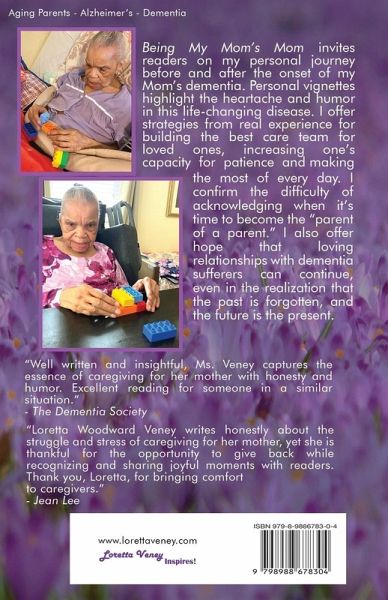 "Being My Mom's Mom" invites readers on my personal journey before and after the onset of my Mom's dementia. Personal vignettes highlight the heartache and humor in this life-changing disease. I offer strategies from real experience for building the best care team for loved ones, increasing one's capacity for patience, and making the most of every day. I confirm the difficulty of acknowledging when it's time to become the "parent of a parent". I also offer hope that loving relationships with dementia sufferers can continue, even in the realization that the past is forgotten, and the future is the present.