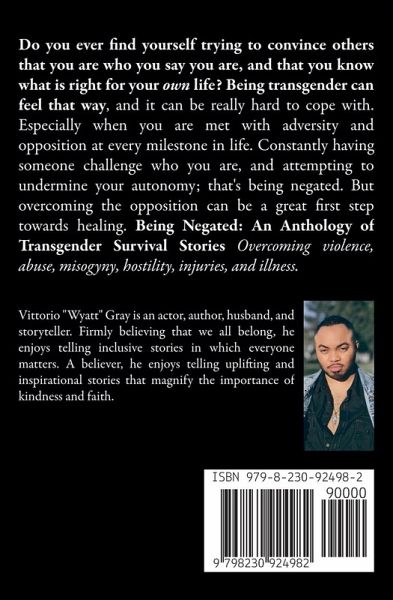 Do you ever find yourself trying to convince others that you are who you say you are, and that you know what is right for your own life? Being transgender can feel that way, and it can be really hard to cope with. Especially when you are met with adversity and opposition at every milestone in life. Constantly having someone challenge who you are, and attempting to undermine your autonomy, that's being negated. But overcoming the opposition can be a great first step towards healing. Being Negated: An Anthology of Transgender Survival Stories is a collection of experiences from some of the different transgender neighbors within our community. This book is important to me because each of these characters carries a piece of my story as they tell their own. Stories of surviving against the odds, and resilience through dire circumstances; violence, abuse, misogyny, hostility, injuries, and illness. Stories of transgender and transsexual people overcoming the odds that were stacked so high against them. This First Edition print copy includes a new character, Genevieve, another voice from the community who illuminates a different angle of it.
