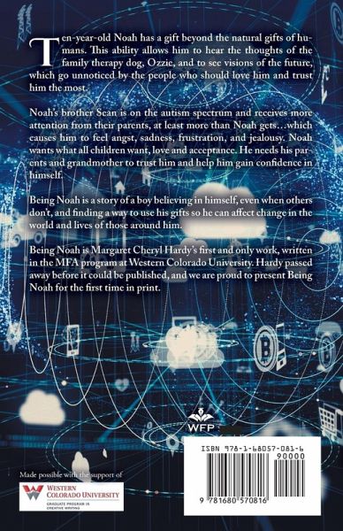 Ten-year-old Noah has a gift beyond the natural gifts of humans. This ability allows him to hear the thoughts of the family therapy dog, Ozzie, and to see visions of the future, which go unnoticed by the people who should love him and trust him the most. Noah’s brother Sean is on the autism spectrum and receives more attention from their parents, at least more than Noah gets…which causes him to feel angst, sadness, frustration, and jealousy. Noah wants what all children want, love and acceptance. He needs his parents and grandmother to trust him and help him gain confidence in himself. Being Noah is a story of a boy believing in himself, even when others don’t, and finding a way to use his gifts so he can affect change in the world and lives of those around him. Being Noah is Margaret Cheryl Hardy’s first and only work, written in the MFA program at Western Colorado University. Hardy passed away before it could be published, and we are proud to present Being Noah for the first time in print.