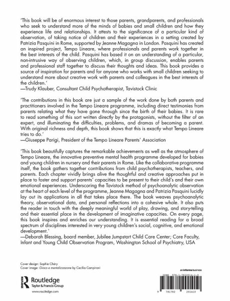 Introduction On Learning To Observe The Tempo Lineare project Listening to and sharing the experience of growth Nursery as therapist: understanding the "present moment" of the child Weaving bonds: Tempo Lineare a school for life How The Young Mind Is Built Emotional and cognitive development: from chaotic experiences to experiences made "thinkable" Becoming a parent of an adopted child Primitive protections used by fostered and adopted children An adopted child developing within a nursery group Feeling good feeling bad; being good and being bad The observation of children with eating difficulties Compassionately Comprehending Children Playing A way of looking at a child that contains and creates meaning A special time for playing and thinking together Developing altruistic skills in Tempo Lineare: 'The Island of Puppies" Creating space in the family for imagination and creativity Living in a group: children learning to know themselves and others From One Tale Another Tale is Born The children's fairy tales From tales to life and from life to tales "The Queen of the Caramels" The Couple The Family The Group and Society Some good reasons to support public services devoted to children The couple's cradle for the inner child "The paternal role" in relation to siblings' love gratitude greed and revenge Men in the nursery: a discussion-play group with fathers and their infants and toddlers Welcoming and listening while working with children parents and nursery staff Parents Creating and Collaborating The parents speaking