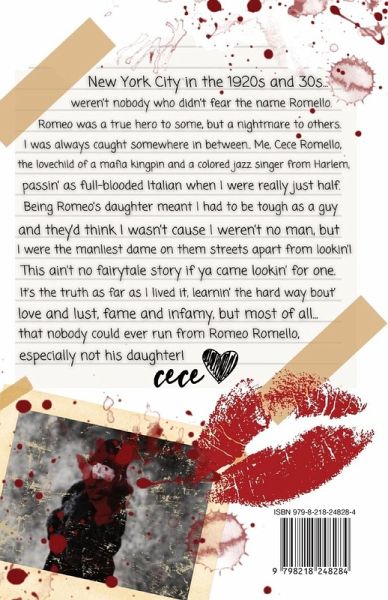 New York City in the 1920s and 30s...weren't nobody who didn't fear the name Romello. Romeo was a true hero to some, but a nightmare to others. I was always caught somewhere in between. Me, Cece Romello, the lovechild of a mafia kingpin and a colored jazz singer from Harlem, passin' as full-blooded Italian when I were really just half. Being Romeo's daughter meant I had to be tough as a guy and they'd think I wasn't cause I weren't no man, but I were the manliest dame on them streets apart from lookin'! This ain't no fairytale story if ya came lookin' for one. It's the truth as far as I lived it, learnin' the hard way bout' love and lust, fame and infamy, but most of all...that nobody could ever run from Romeo Romello, especially not his daughter!