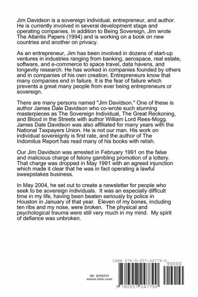 Essays by Jim Davidson including excerpts from The Indomitus Report. This book covers topics on individual sovereignty, agorism, freedom, arms and armor technology, guns, launch vehicles, missiles, the space frontier, extra-solar planets, longevity research, culture, society, films, nanotechnology, privacy technology, and travel to Africa, Europe, Asia, and North America.