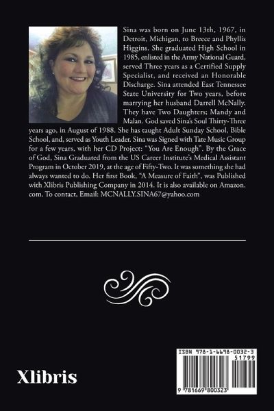 Sina was born on June 13th, 1967, in Detroit, Michigan, to Breece and Phyllis Higgins. She graduated High School in 1985, enlisted in the Army National Guard, served Three years as a Certified Supply Specialist, and received an Honorable Discharge. Sina attended East Tennessee State University for Two years, before marrying her husband Darrell McNally. They have Two Daughters; Mandy and Malan. God saved Sina's Soul Thirty-Three years ago, in August of 1988. She has taught Adult Sunday School, Bible School, and, served as Youth Leader. Sina was Signed with Tate Music Group for a few years, with her CD Project: "You Are Enough". By the Grace of God, Sina Graduated from the US Career Institute's Medical Assistant Program in October 2019, at the age of Fifty-Two. It was something she had always wanted to do. Her first Book, "A Measure of Faith", was Published with Xlibris Publishing Company in 2014. It is also available on Amazon.com. To contact, Email: MCNALLY.SINA67@yahoo.com