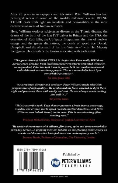 After 70 years in newspapers and television, Peter Williams has had privileged access to some of the world's milestone events. BEING THERE casts fresh light on incidents and personalities in the most controversial areas of human activities. Here, Williams explores subjects as diverse as the Titanic disaster, the drama of the birth of the first IVF babies in Britain and the USA, the execution of Ruth Ellis, the US Space Programme, the risks of nuclear energy and the green alternatives, the death of speed ace Donald Campbell, and the aftermath of his first "interview" with Her Majesty the Queen. He considers the lessons associated with each event. "The great virtue of BEING THERE is the fact that Peter really WAS there. Across seven decades, from local newspaper reporter to respected television correspondent, Peter has told truth to power, held our masters to account and celebrated extraordinary people. This is a remarkable book by a remarkable journalist." - Sir Clive Jones CBE "As a reporter, director and producer, Peter Williams made television programmes of high quality... He established the facts, checked he'd got them right and presented them with clarity and zest. He was always worth reading. And still is..." - Sir Jeremy Isaacs "This is a terrific book. Each chapter presents a fresh drama, espionage, murder, war crimes, world speed records, nuclear disasters... and Peter Williams was indeed 'there', on the case. This is an enthralling often startling read." - Professor Michael Irwin, Professor of English, University of Kent "He writes of encounters with villains, film stars, spies and some remarkable everyday heroes... A gripping memoir but also an enlightening commentary on events and dramas that have fashioned our contemporary world". - Suzanne Franks, Professor of Journalism, City University, London